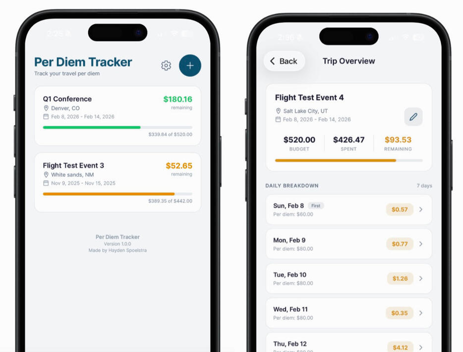 Per Diem Tracker is a mobile app I built to solve a common frustration in flight-test and government travel: keeping track of daily per diem amounts while on the road. The app calculates remaining daily allowances, handles “per diem except” days, and logs expenses with receipt photos for easy voucher creation.It’s built with React Native/Expo and currently in TestFlight with real beta users. Android support is underway. The app focuses on speed, clarity, and offline-friendly functionality, no complex menus, just the tools travelers actually need.I built this from scratch: UI/UX, code, backend integration, and analytics. It’s been incredibly rewarding to watch other engineers adopt it into their travel workflow.